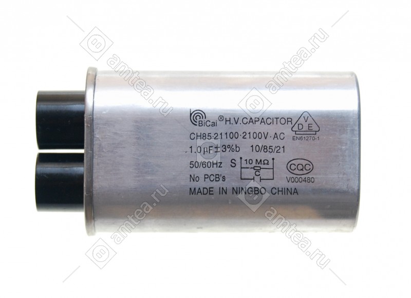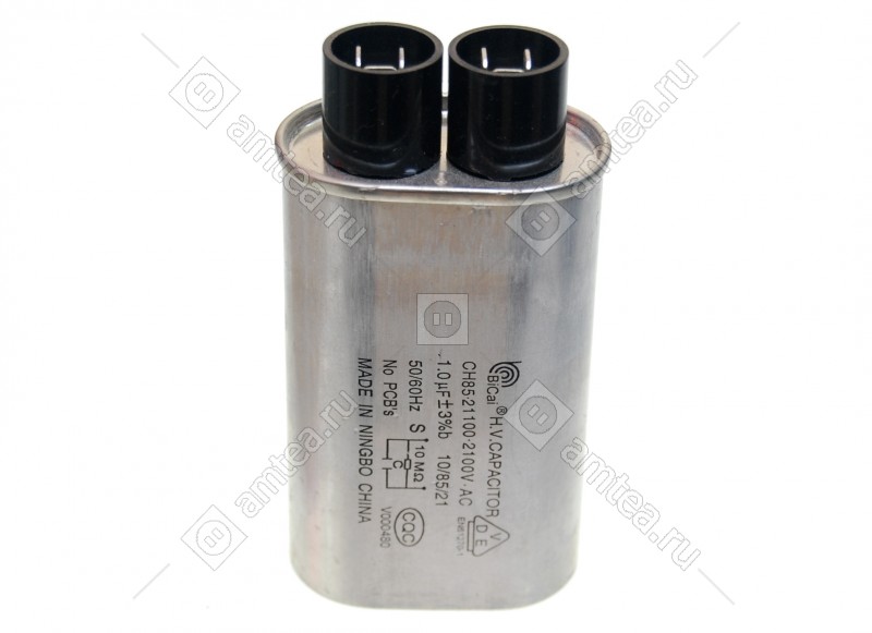 Конденсатор является функциональной частью микроволновой (СВЧ) печи. Как правило, при выходе из строя вздувается, на корпусе появляются бугры, вздутия, либо полная деформация корпуса с его разгерметизацией. Но бывают и случаи выхода из строя без видимых дефектов. При замене полярность подключения не имеет значения. Имее 2 вывода с 2-4 контактами на каждом выводе.