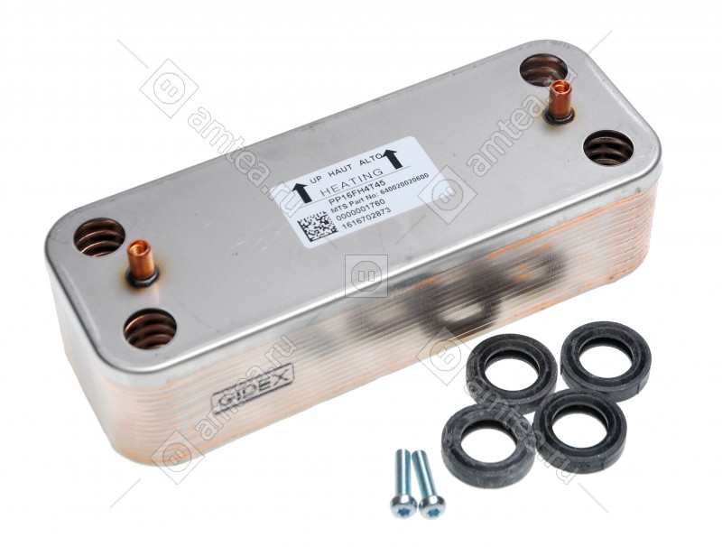 Служит для передачи тепловой энергии от одного тепоносителя к другому. Применяется в двухконтурных котлах. Причины выхода из строя - забивание отверстий солями, которые попадают из первичного теплообменника (который обогрвается газовым пламенем). Вторая причина - нарушение грметичности, т.е. теплообменник начинает подтекать в метсе спайки пластин. Неремонтопригоден, меняется на новый. 16 пластин